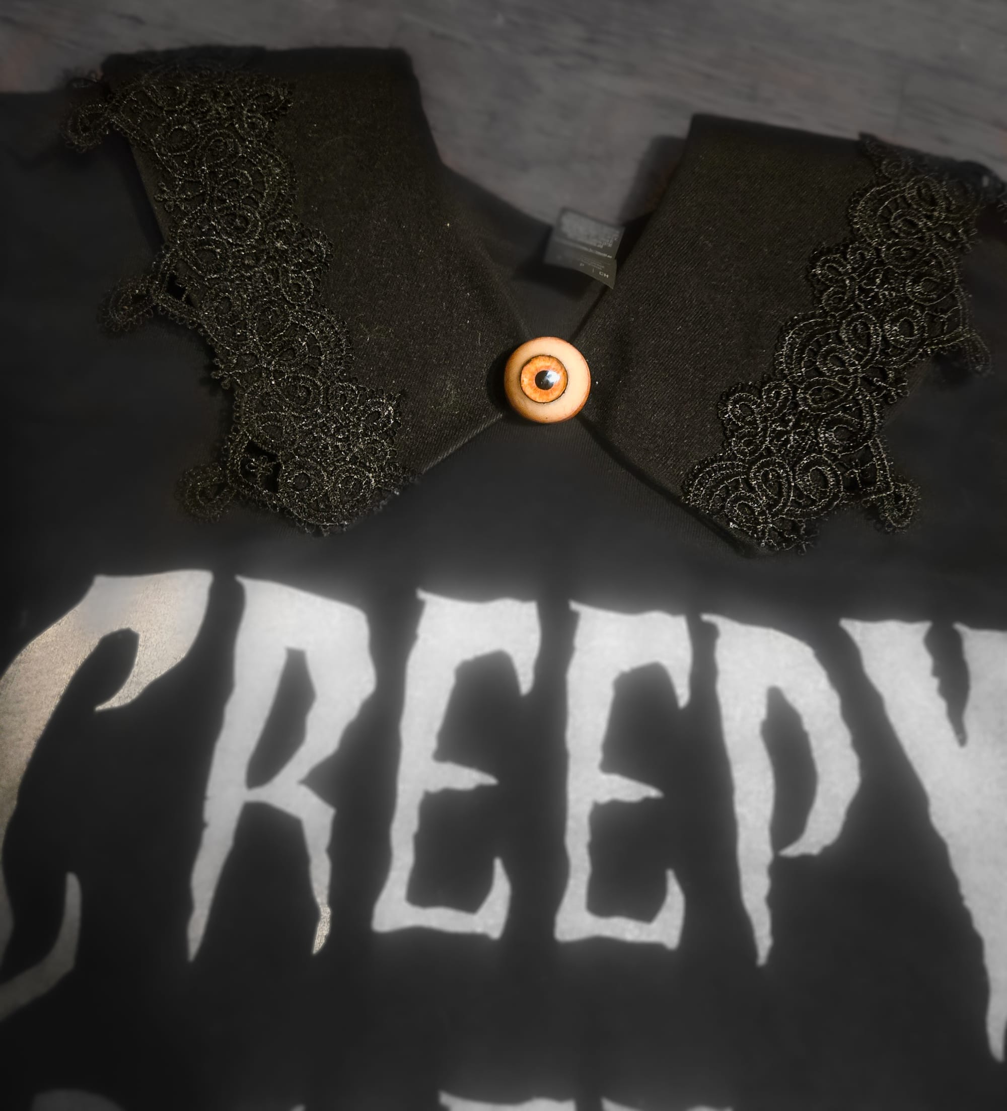 This Resurrected Dress is complete with a signature detachable collar with lace details and a creepy eye gracing the middle. The eye is actually a sentimental piece of history for Nicole, as this was created in her college days in her Hair, Teeth and Eyes class (EXACTLY how it sounds) in her special fx Entertainment Design degree. She had many left over from this and decided to top this special piece like the cherry on top of a cake.