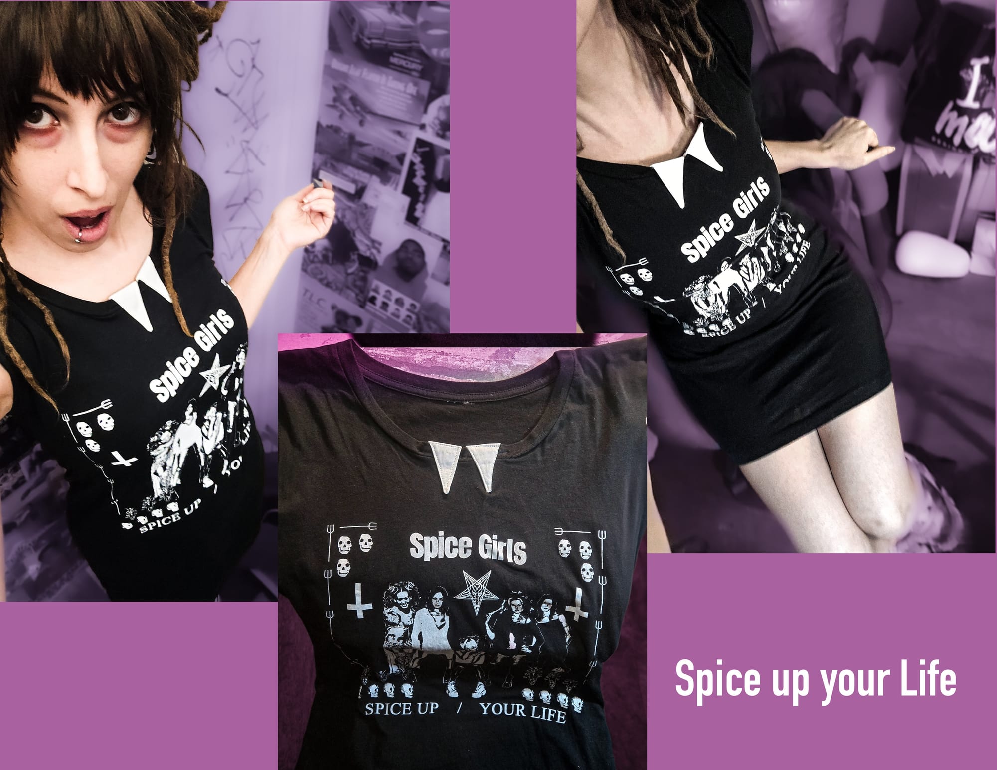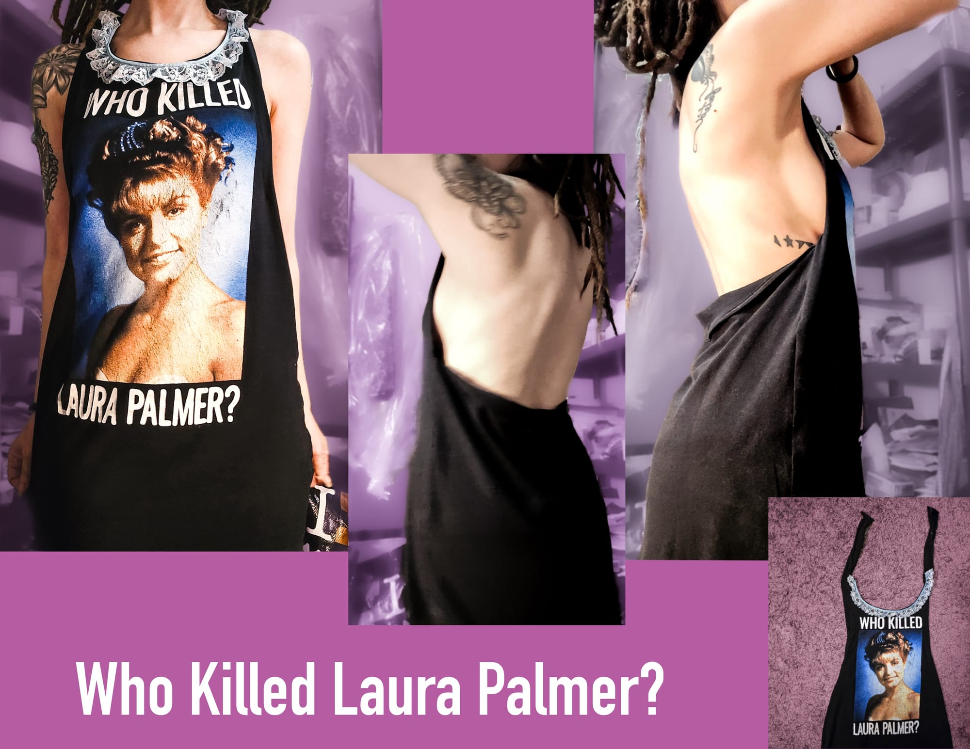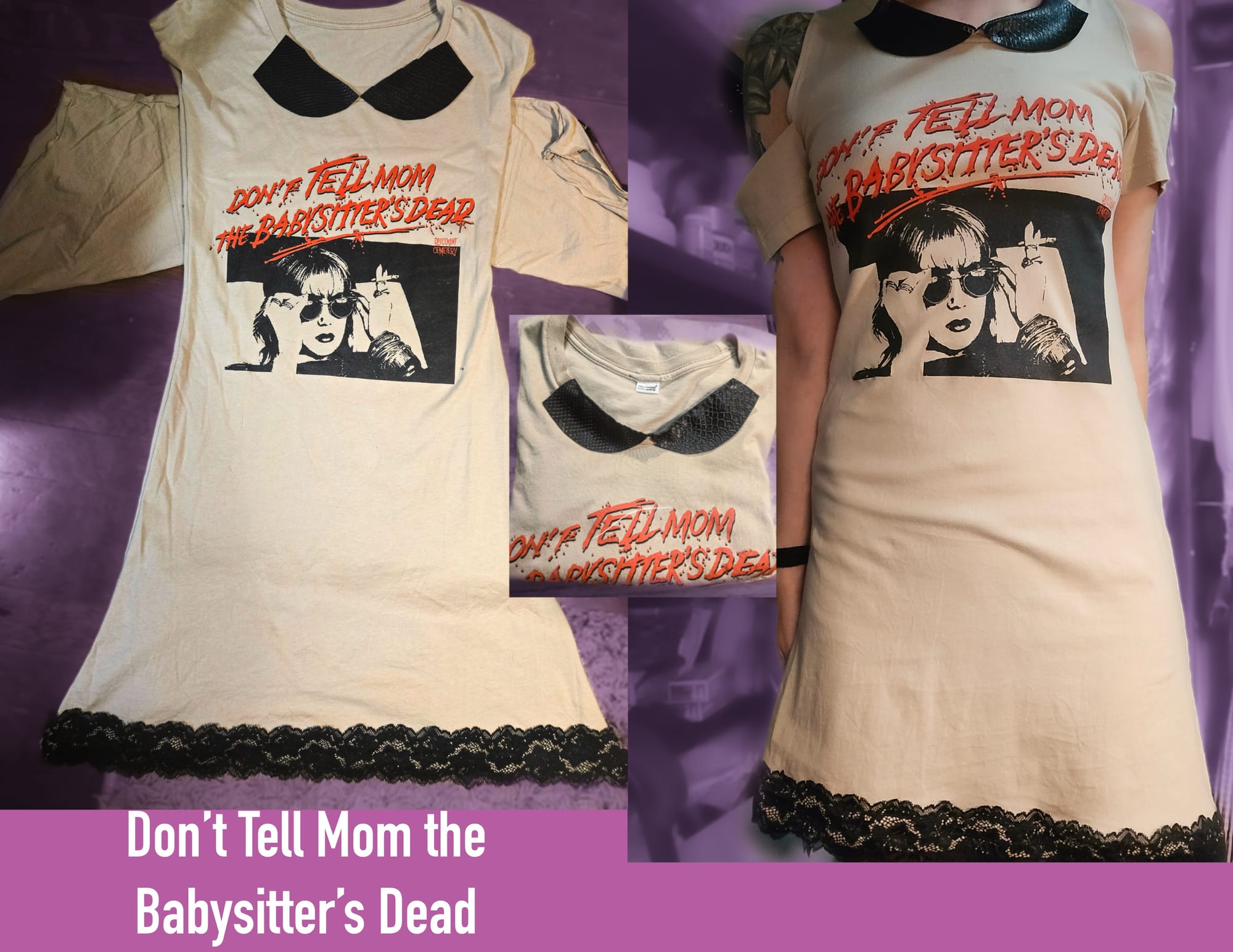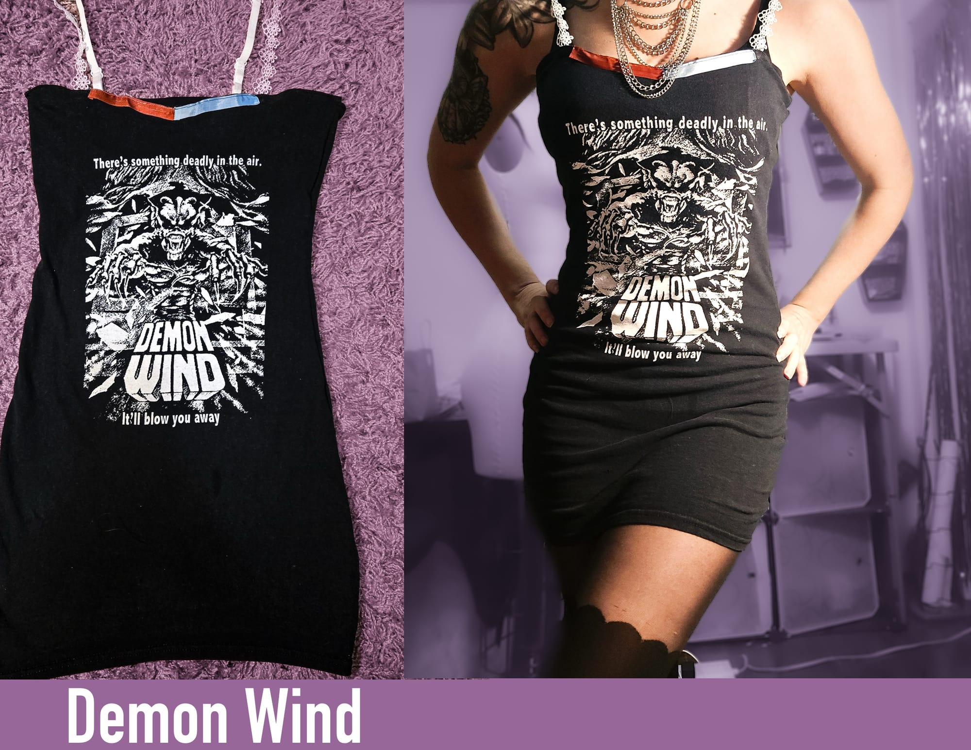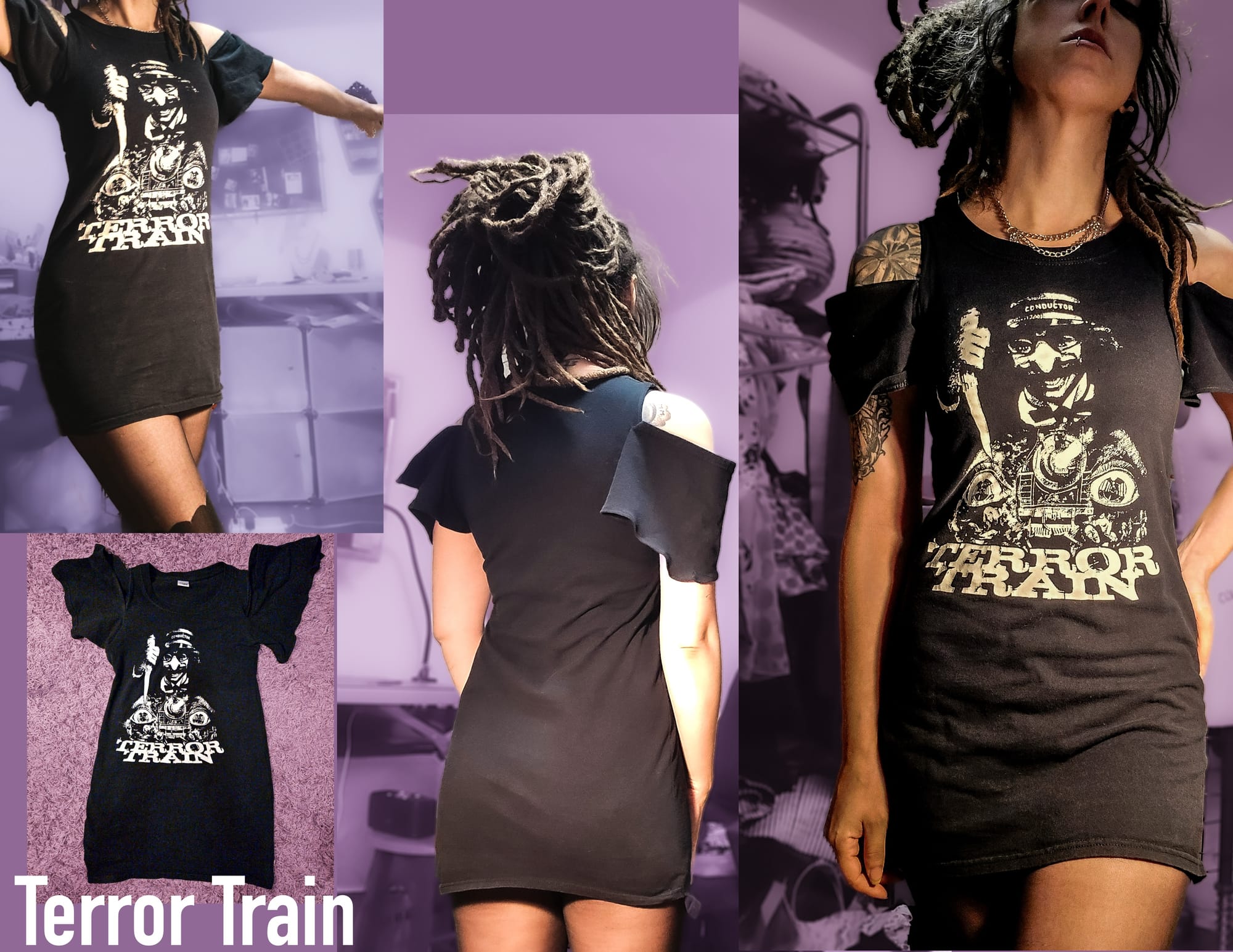 The collaboration started when Steal City Vintage came into some pretty cool horror themed movie tees in size 2x. Knowing that Revenant Wares is a brand that likes to repurpose and bring old things new life, they decided to give a bundle of 8 shirts for us to design into dresses. Oddly enough, this is how creator of Revenant Wares originally started sewing and using her passion for diy and repurpose into wearable art and new creations. Her first client was completely by happenstance (Revenant Wares wasn‘t even considered yet at this point!), Naomi Grossman in 2015..