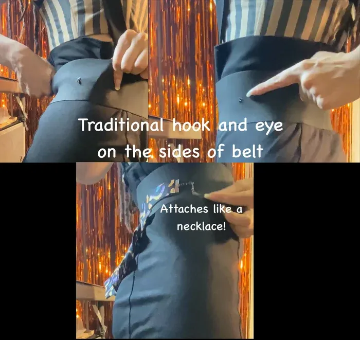 This modern take on a bustle skirt features hook and eye attachments on either side of the belt for the ability to attach your Reanimated Romantic and Frills&Thrills collars!