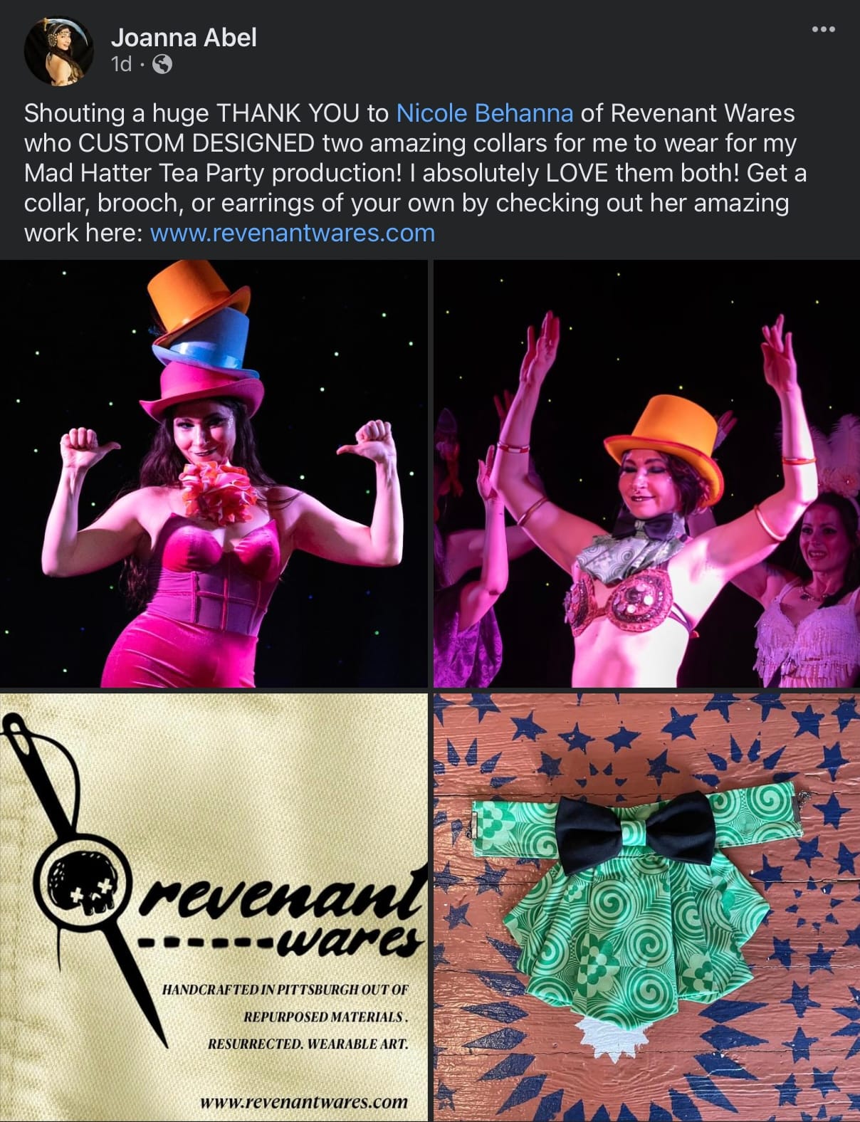 Every year an Alice in Wonderland/Mad Hatter inspired show hits Pittsburgh and is led by local bellydance icon Joanna Abel. This year it was at Mr Smalls Funhouse in Millville and featured local and traveling performers all going "down the rabbit hole" to bring us new Alice in Wonderland themed acts that all wove together to tell us a story. We were honored to have the opportunity to make Joanna two custom collars (see above) for her Mad Hatter characters in two differnt numbers for this show. OBVIOUSLY, she ROCKED it!